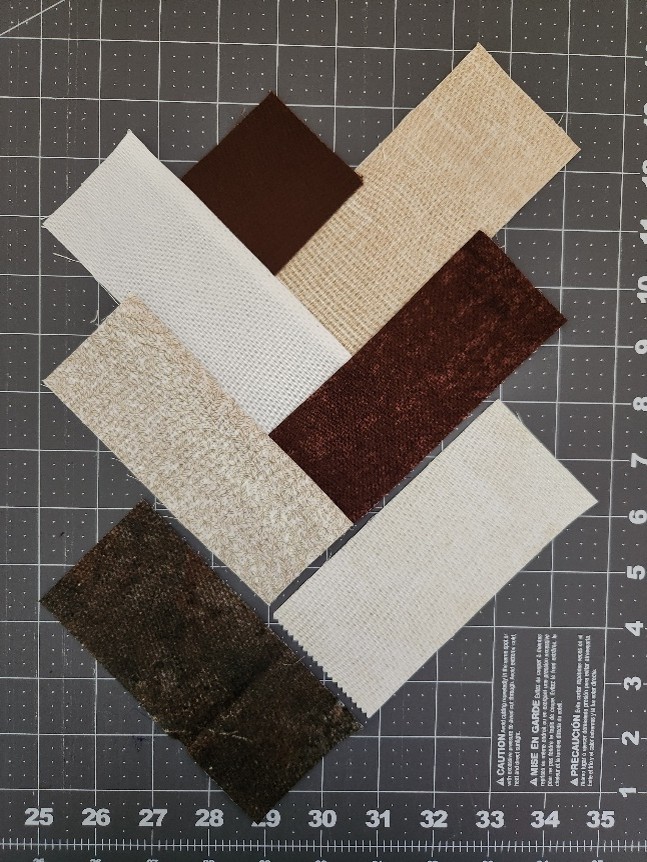 - 1/4 yd. each of 6 neutral fabrics (cream, beige, gold, taupe, brown, espresso, etc.), either solid or subtly printed