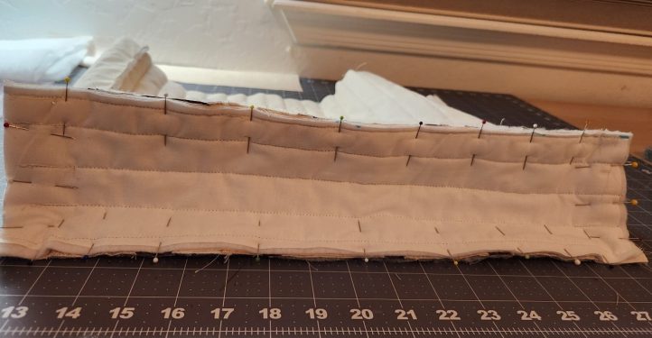 - Side panels – 14 in. x 4 in. piece of muslin at the bottom, matching size batting in the middle and gold side panel fabric at the top.