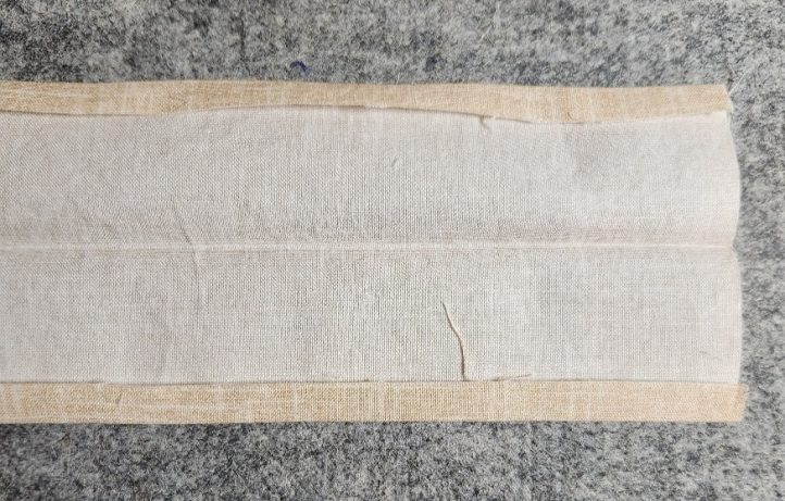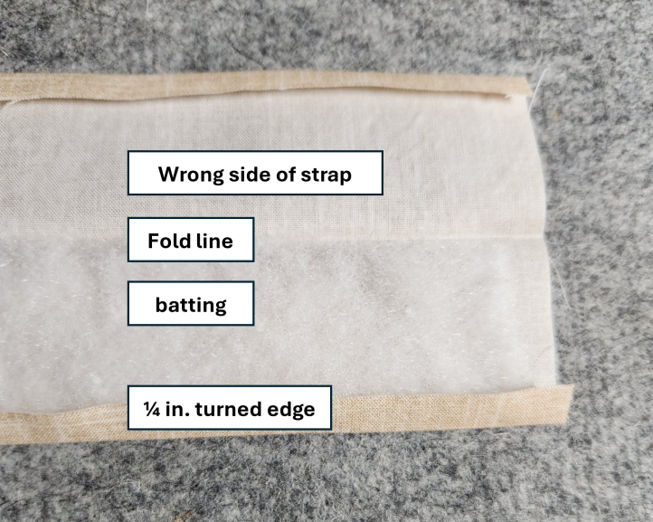 - Press each strap in half lengthwise. Open out and place a strip of batting along the fold. Overlap the 1/4 in. turned under edge over the batting.