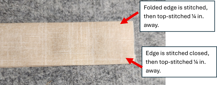 - Fold the top half of the strap over the batting. Pin the edges closed. Stitch close to the edge, then stitch again 1/4 in. from first stitching. Repeat on the other side of each strap.