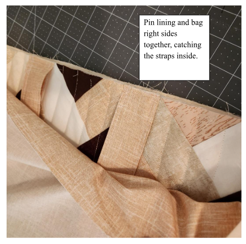 - Pin the top edge of the bag and lining together, matching the side seams and catching the straps in the seam. Stitch using a 1/2 in. seam allowance.