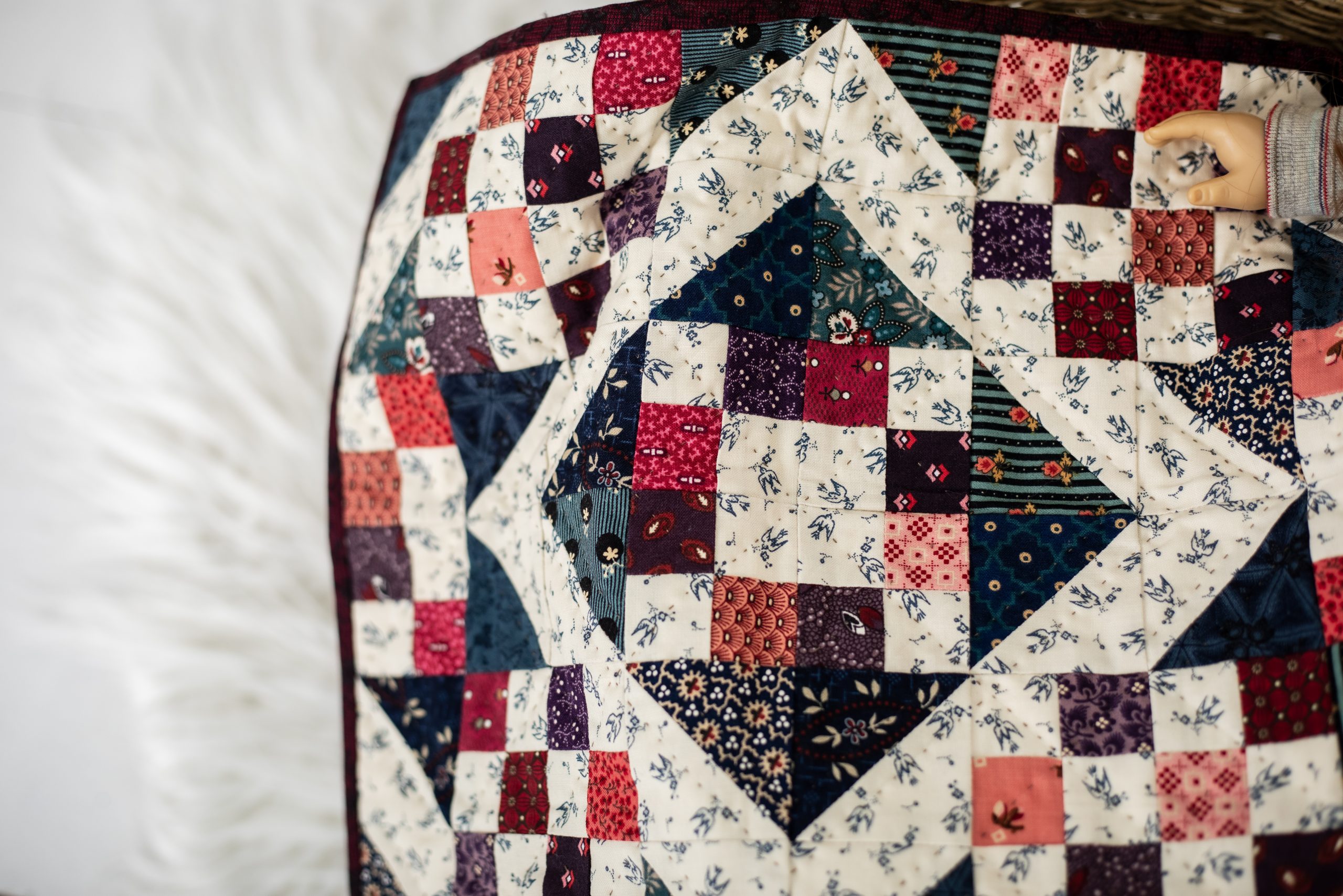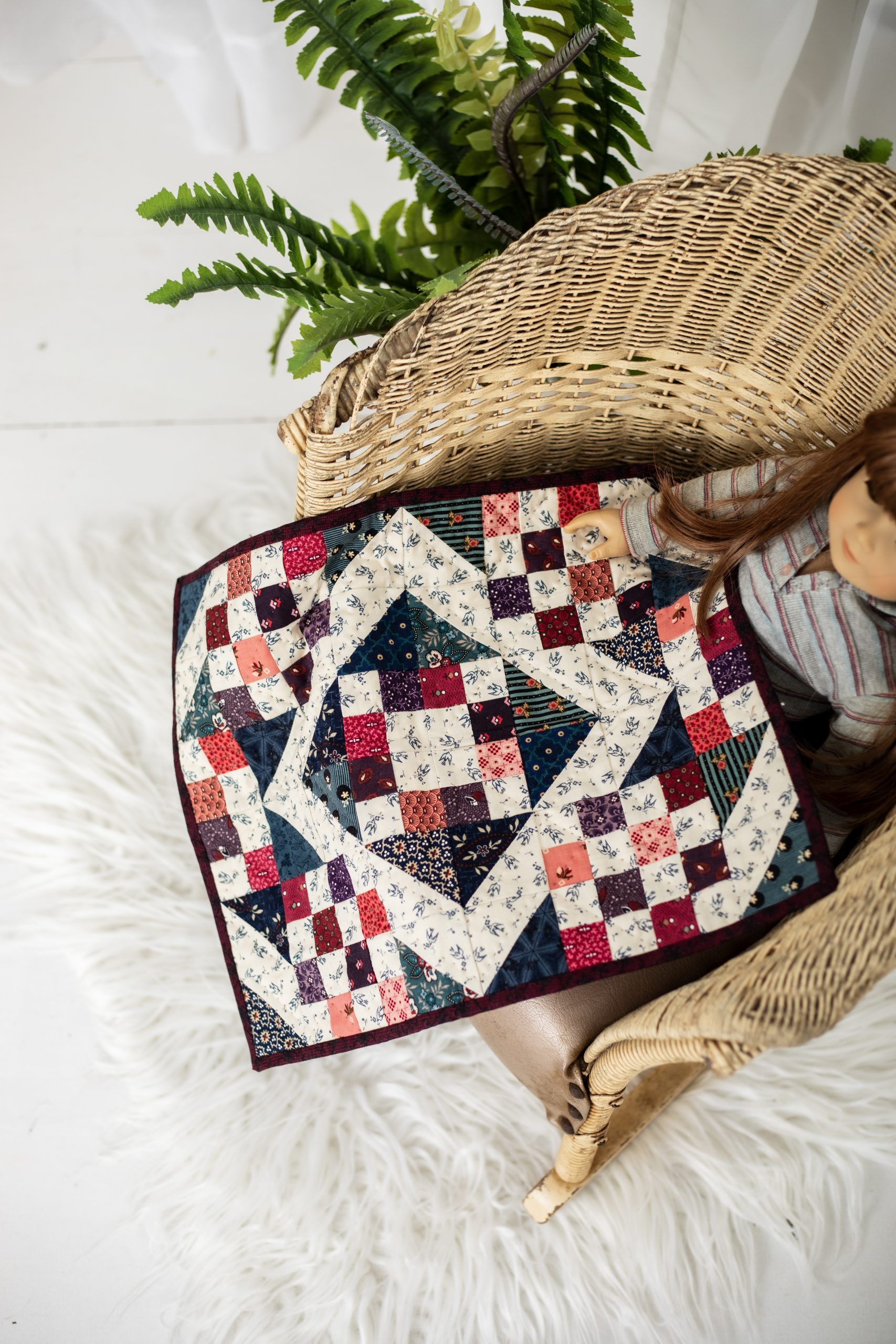 Your child or grandchild will be so excited to receive their own handmade doll quilt! Originally featured in our sister magazine We Like Quilting, this doll quilt pattern from Marian Edwards can be made using fabric scraps or fat eighths and fat quarters, making it a budget-friendly project for sewists and quilters. This doll quilt measures 12 1/4 inches by 15 3/4 inches, so it’s a great accessory for 18-inch dolls from brands like American Girl and Our Generation.